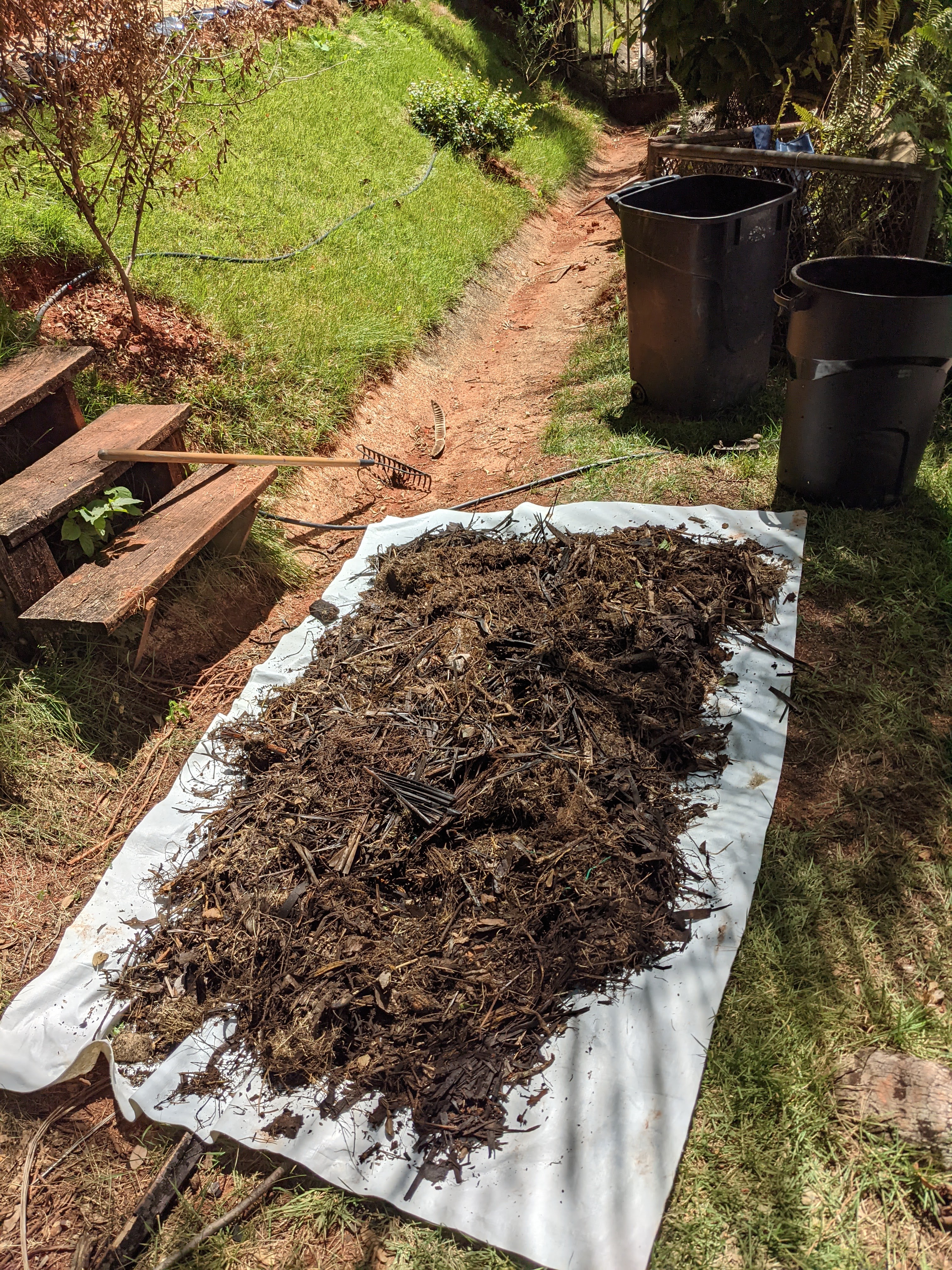 - Next, I dumped out my (now two!) compost bins onto a tarp. The compost smelled nice and earthy.