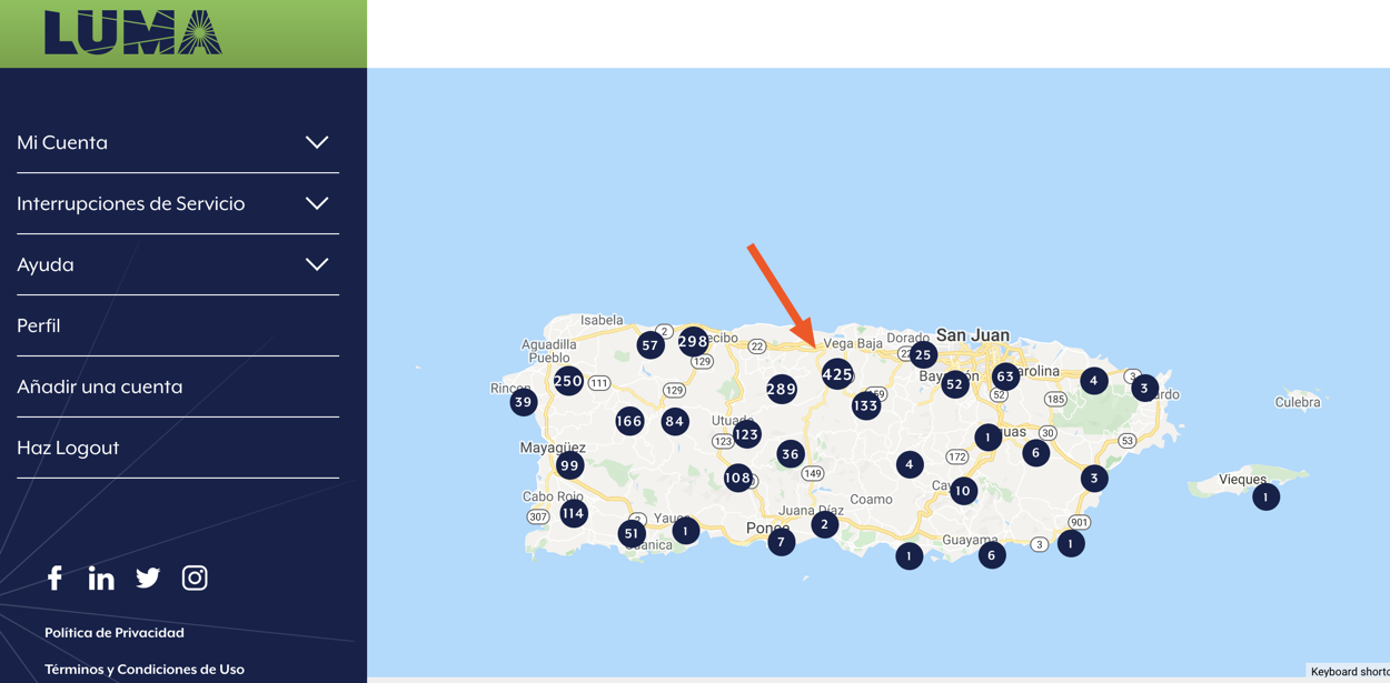 A power outage is called “un apagón”, and you can see all the reported apagones on the website for LUMA, the controversial recently-privatized distributor of energy on the island. I took this screenshot from their site on a sunny Friday afternoon: