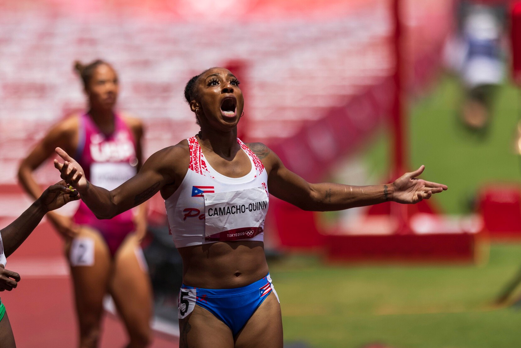 Monica Puig (left, source) and Jasmine Camacho-Quinn (source) react to winning gold medals at the 2016 and 2020 Olympic games, respectively.