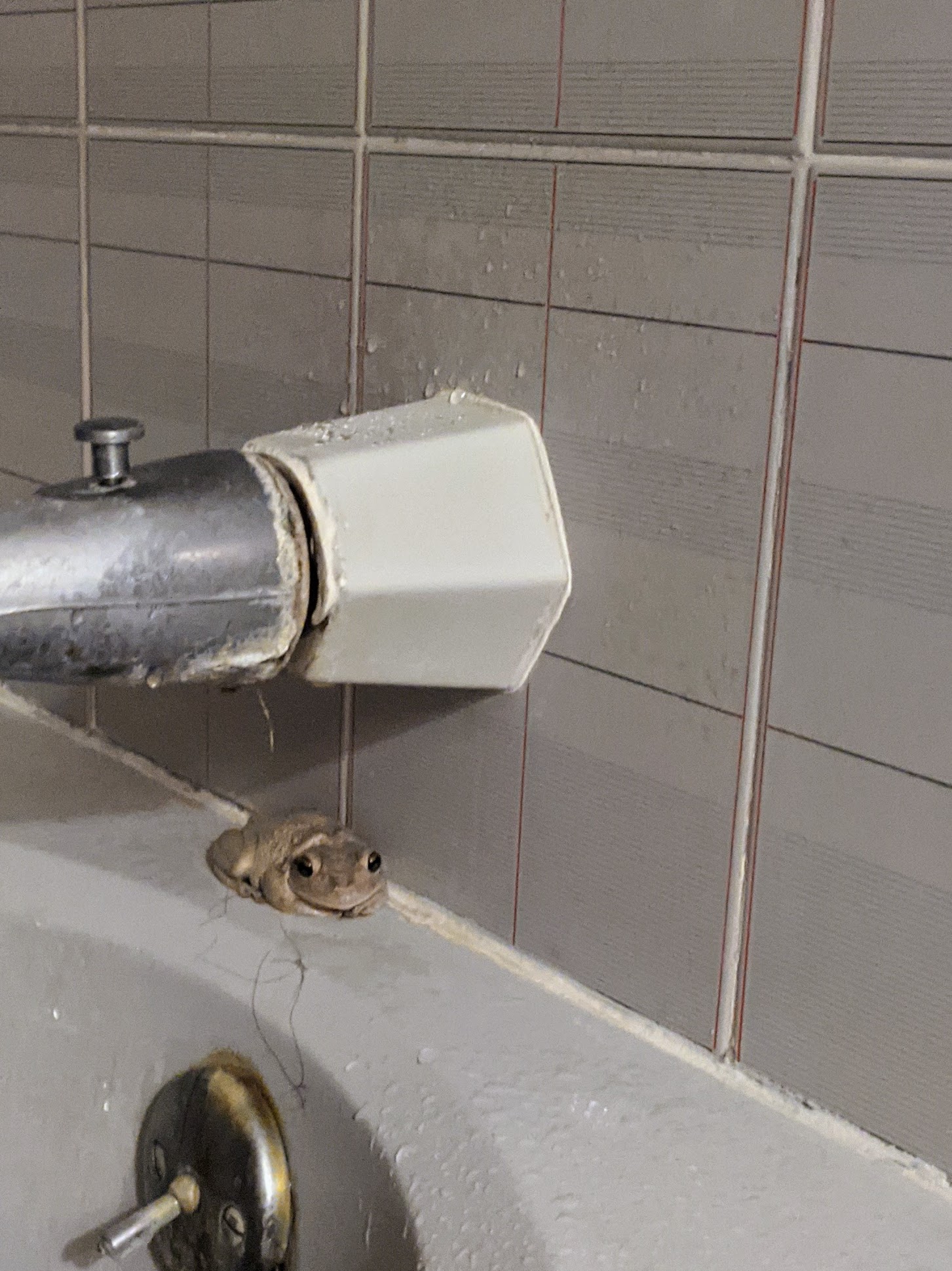 The second time: Two weeks later and I’m just about to enter the shower when I noticed little wet spots on the bathroom floor, as if someone had just gotten out of the shower. I pulled back the curtain and sitting there was the frog, looking up at me in my birthday suit. I again chased him around the room and trapped him and threw him outside.